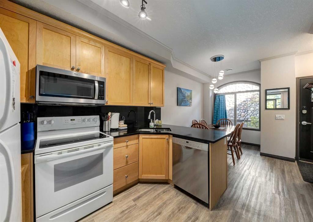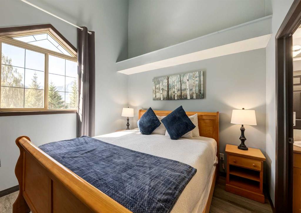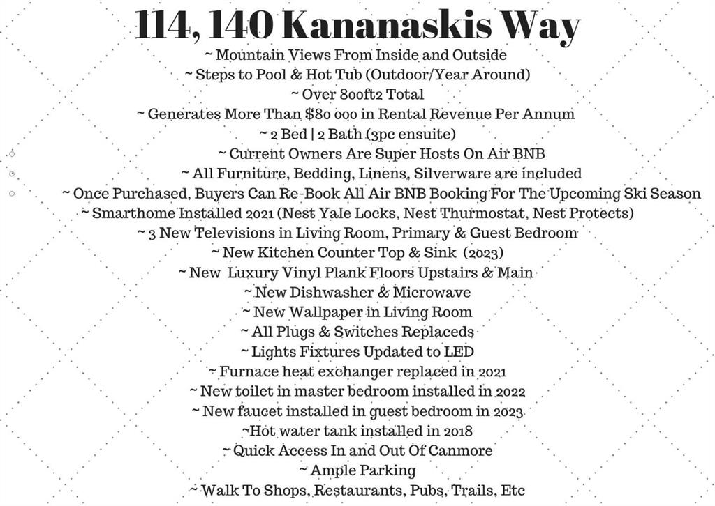 We’re extremely proud to present an opportunity for anyone wanting to own an amazing investment property in the Rocky Mountains. A place to hang your hat when you need some time outside hiking, skiing or sitting on the patio, or in the pool enjoying your view of the Three Sisters. The property currently operates as a highly profitable vacation rental with a significant cash flow business (financial disclosure available), so you can earn passive income while you sleep! This luxury townhouse is a fully furnished, 2 bed, 2 full bath unit in Mystic Springs Chalet: one of Canmore’s most desirable and profitable resorts. The updated, open concept layout featurs a spacious living room w/river rock fireplace, newer luxury vinyl plank flooring, new countertops, new dishwasher, new microwave, all plugs & switches modernized, and LED lights installed throughout. It’s not all aesthetics either with a new furnace heat exchanger, new toilet in primary, new faucet and a hot water tank installed in 2018! The upper level has a true “mountain escape” vibe, featuring vaulted ceilings & includes a 3pc ensuite in the primary bedroom. This complex receives an elevated demand compared to other hotels in the area due to its functional layout, the private suite entrances which provide easy access to outdoor pool (open year-round) & hot tub. Access to the complex is amazing as well, it’s a quick in and out of town so you can be first on the hill or last on the trails, and it’s just steps to the shops, restaurants, and pubs of Downtown. Did we mention all the furniture, TV’s, cutlery, bedding, dishes, and linens are included?!? This place is an absolute dream come true for owners and visitors alike. GST is included in the price, we’re always excited to share information and elaborate on the potential in here, so please book a showing today and come see your next great conquest!