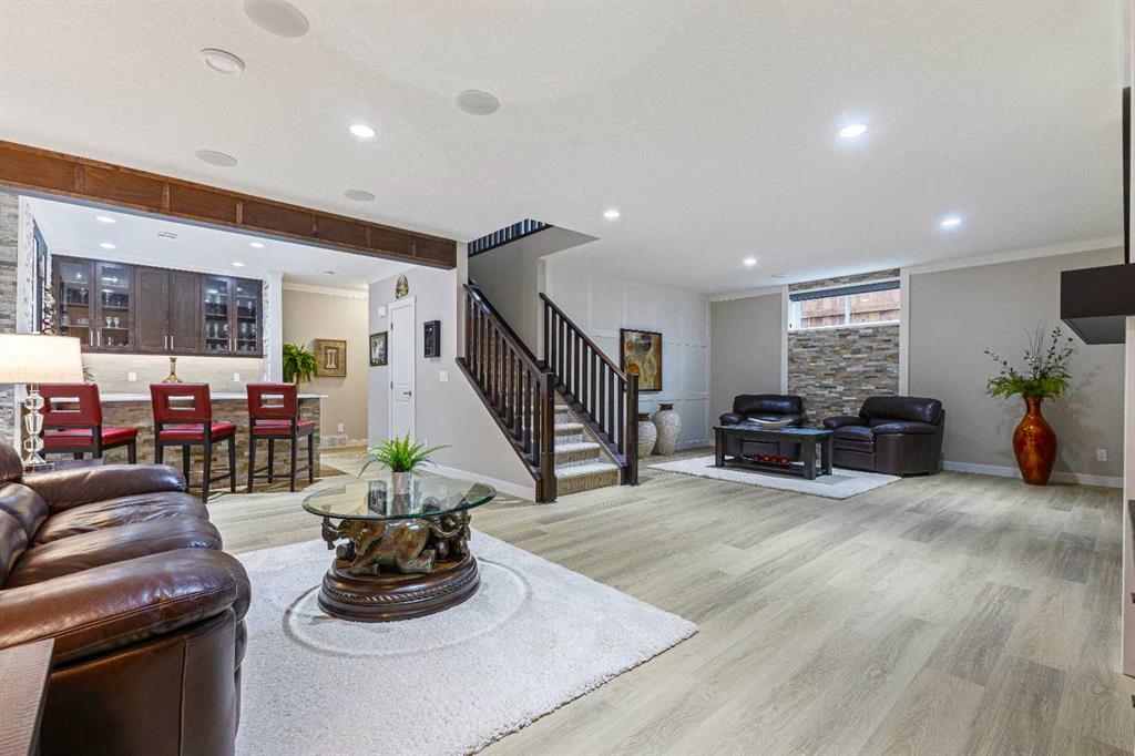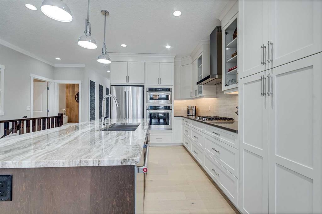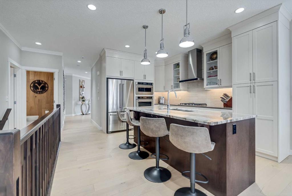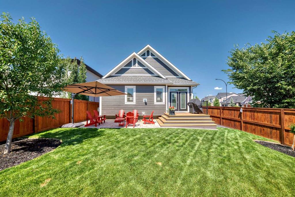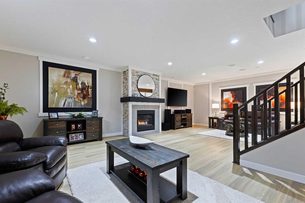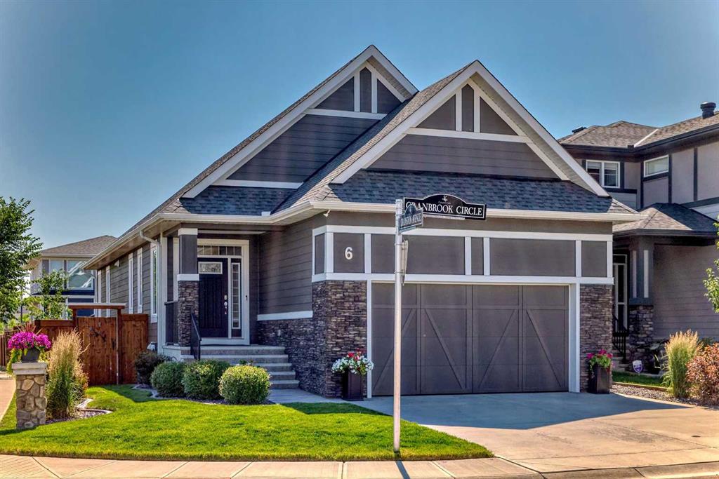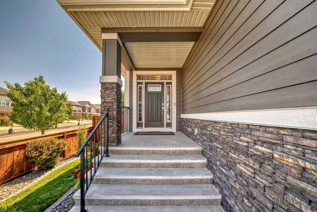 Welcome to luxury living in Cranston Riverstone. This former show home sits on a prime corner lot just steps from the scenic Riverwalk and Bow River, offering a lifestyle of elegance, comfort, and convenience. Inside, this fully upgraded, air-conditioned bungalow features over 2,712 sq. ft. of thoughtfully designed living space. The main level boasts 9′ ceilings, wide-plank engineered hardwood flooring, and detailed millwork that creates a refined, sophisticated ambiance. An open-concept layout highlights a stylish living room with a stone-clad gas fireplace (with adjustable fan), custom accent wall, and hidden compartment for a clean, clutter-free look. The chef’s kitchen is built to impress with premium built-in KitchenAid appliances, gas cooktop, custom soft-close cabinetry, under-cabinet LED lighting, and a large island featuring dual power outlets and garburator-ready wiring. The primary suite is a serene retreat with a striking stone feature wall, custom walk-in closet with glass-front drawers and full-length mirrors, and a spa-inspired ensuite with a tiled shower, bench, and built-in wall niches. The fully developed basement has just been upgraded with beautiful white oak luxury vinyl plank flooring and offers a theater-ready family room wired for 7.1 surround sound, a sleek wet bar with full cabinetry, home gym space, and a second fireplace with built-in fan. Smart and stylish throughout, this home includes keyless entry (front and garage), smart home wiring for future upgrades, central vacuum on all levels including the garage, motion-sensor lighting in closets, LED dimmer switches, and an oversized 12’ garage perfect for storage or a car hoist. The professionally landscaped yard is low maintenance and includes built-in blinds in the double garden doors, a BBQ gas line, deck outlets, two exterior water taps, outdoor pot lights on timers, hot/cold garage taps, a slat-wall garage system, and exterior keypad entry. This home truly blends luxury and lifestyle—don’t miss your chance to experience it.