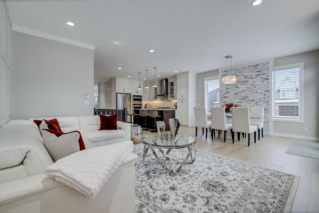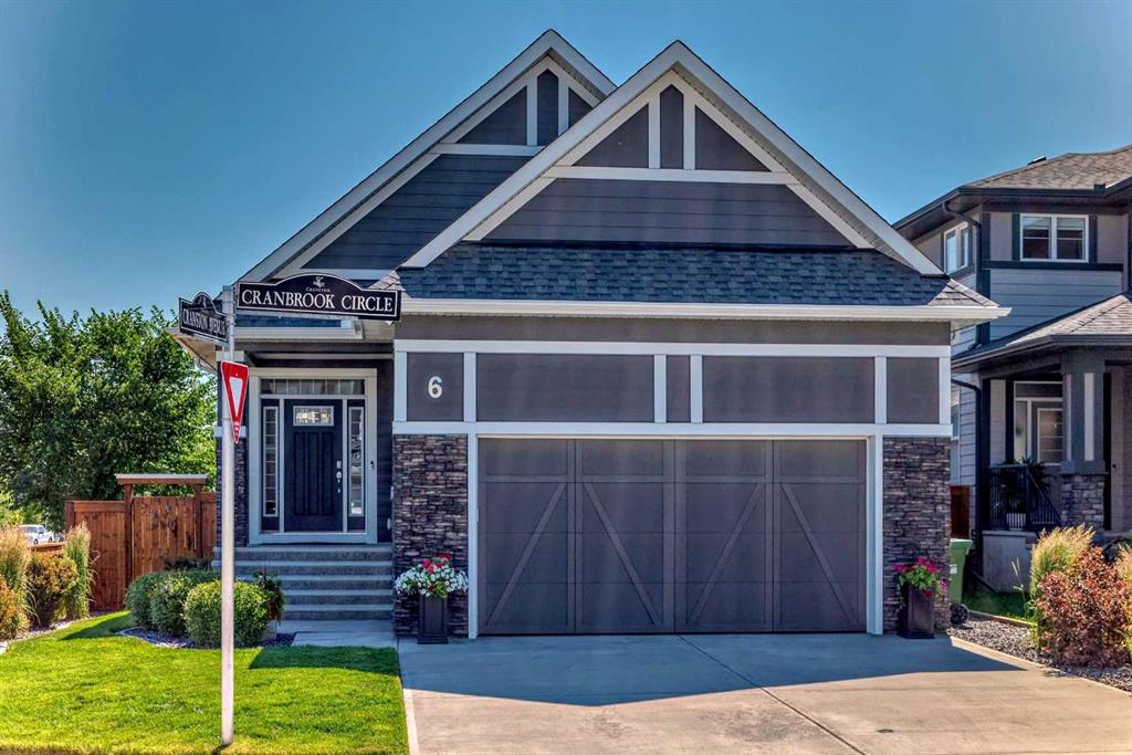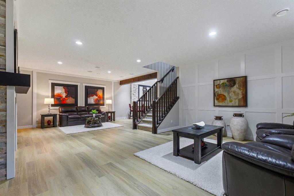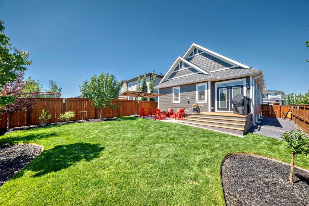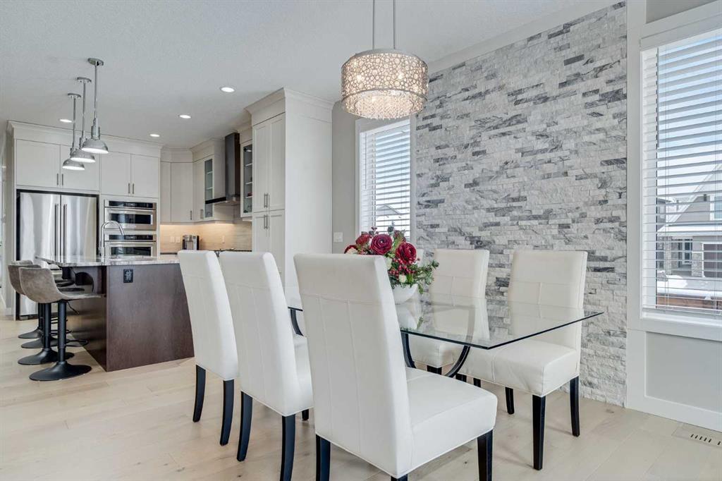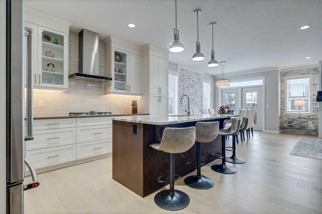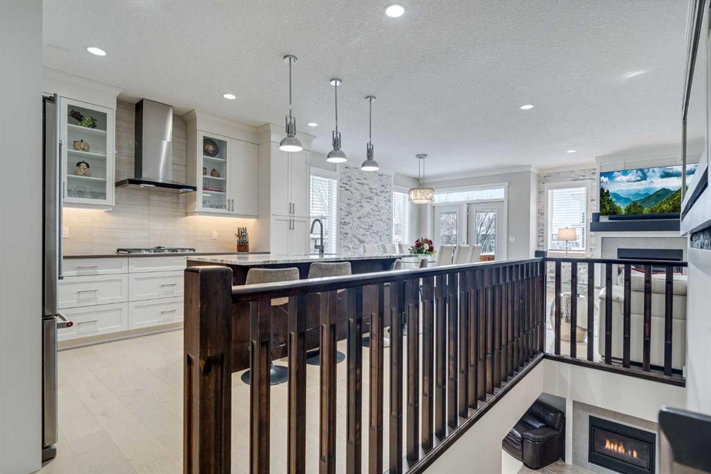 Welcome to luxury living in Cranston Riverstone. This former show home sits on a prime corner lot just steps from the scenic Riverwalk and Bow River, offering a lifestyle of elegance, comfort, and convenience. Inside, this fully upgraded, air-conditioned bungalow features over 2,712 sq. ft. of thoughtfully designed living space. The main level boasts 9′ ceilings, wide-plank engineered hardwood flooring, and detailed millwork that creates a refined, sophisticated ambiance. An open-concept layout highlights a stylish living room with a stone-clad gas fireplace (with adjustable fan), custom accent wall, and hidden compartment for a clean, clutter-free look. The chef’s kitchen is built to impress with premium built-in KitchenAid appliances, gas cooktop, custom soft-close cabinetry, under-cabinet LED lighting, and a large island featuring dual power outlets and garburator-ready wiring. The primary suite is a serene retreat with a striking stone feature wall, custom walk-in closet with glass-front drawers and full-length mirrors, and a spa-inspired ensuite with a tiled shower, bench, and built-in wall niches. The fully developed basement has just been upgraded with beautiful white oak luxury vinyl plank flooring and offers a theater-ready family room wired for 7.1 surround sound, a sleek wet bar with full cabinetry, home gym space, and a second fireplace with built-in fan. Smart and stylish throughout, this home includes keyless entry (front and garage), smart home wiring for future upgrades, central vacuum on all levels including the garage, motion-sensor lighting in closets, LED dimmer switches, and an oversized 12’ garage perfect for storage or a car hoist. The professionally landscaped yard is low maintenance and includes built-in blinds in the double garden doors, a BBQ gas line, deck outlets, two exterior water taps, outdoor pot lights on timers, hot/cold garage taps, a slat-wall garage system, and exterior keypad entry. This home truly blends luxury and lifestyle—don’t miss your chance to experience it.
