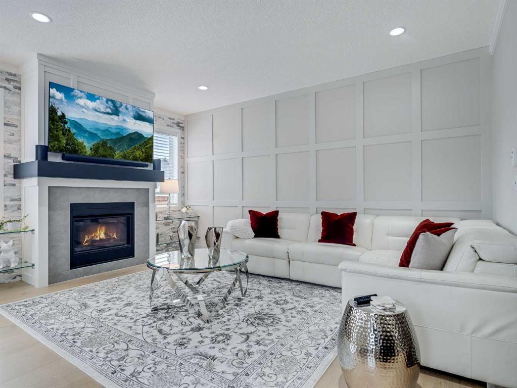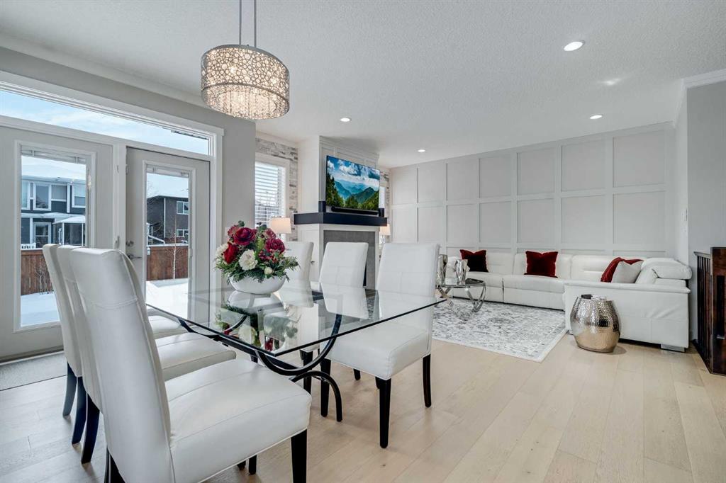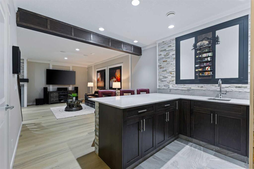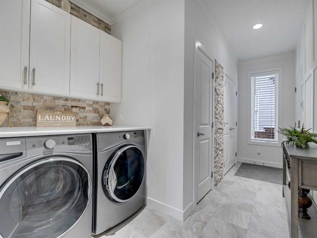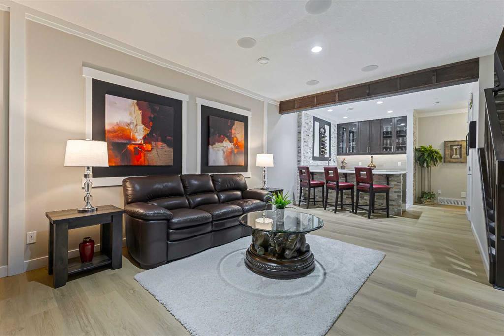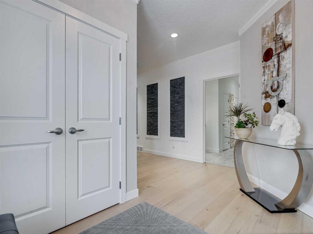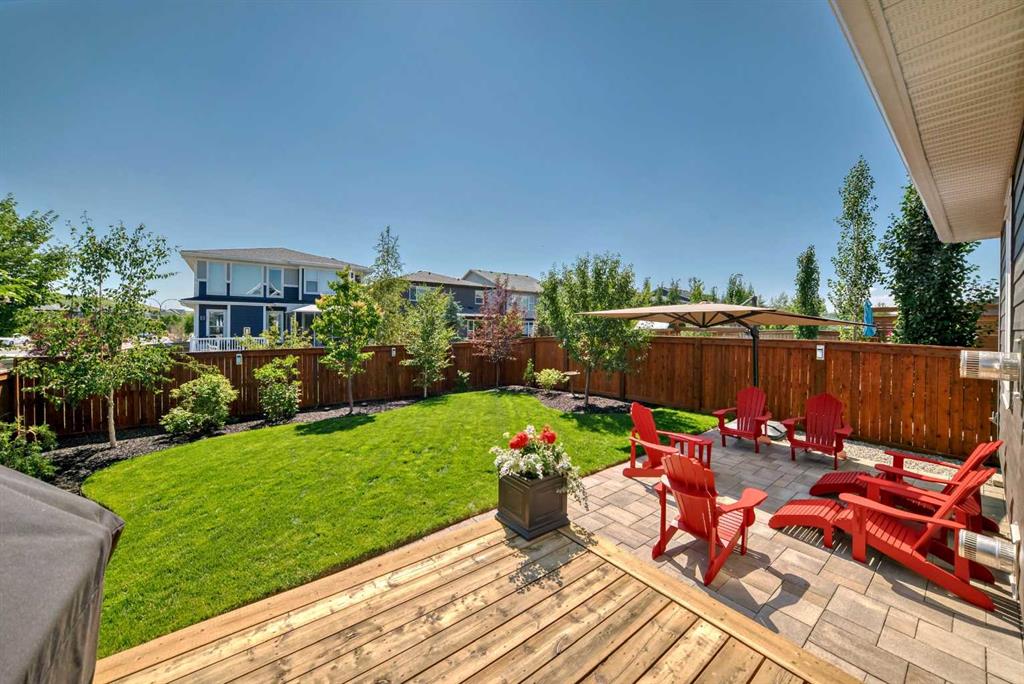 Welcome to luxury living in Cranston Riverstone. This former show home sits on a prime corner lot just steps from the scenic Riverwalk and Bow River, offering a lifestyle of elegance, comfort, and convenience. Inside, this fully upgraded, air-conditioned bungalow features over 2,712 sq. ft. of thoughtfully designed living space. The main level boasts 9′ ceilings, wide-plank engineered hardwood flooring, and detailed millwork that creates a refined, sophisticated ambiance. An open-concept layout highlights a stylish living room with a stone-clad gas fireplace (with adjustable fan), custom accent wall, and hidden compartment for a clean, clutter-free look. The chef’s kitchen is built to impress with premium built-in KitchenAid appliances, gas cooktop, custom soft-close cabinetry, under-cabinet LED lighting, and a large island featuring dual power outlets and garburator-ready wiring. The primary suite is a serene retreat with a striking stone feature wall, custom walk-in closet with glass-front drawers and full-length mirrors, and a spa-inspired ensuite with a tiled shower, bench, and built-in wall niches. The fully developed basement has just been upgraded with beautiful white oak luxury vinyl plank flooring and offers a theater-ready family room wired for 7.1 surround sound, a sleek wet bar with full cabinetry, home gym space, and a second fireplace with built-in fan. Smart and stylish throughout, this home includes keyless entry (front and garage), smart home wiring for future upgrades, central vacuum on all levels including the garage, motion-sensor lighting in closets, LED dimmer switches, and an oversized 12’ garage perfect for storage or a car hoist. The professionally landscaped yard is low maintenance and includes built-in blinds in the double garden doors, a BBQ gas line, deck outlets, two exterior water taps, outdoor pot lights on timers, hot/cold garage taps, a slat-wall garage system, and exterior keypad entry. This home truly blends luxury and lifestyle—don’t miss your chance to experience it.