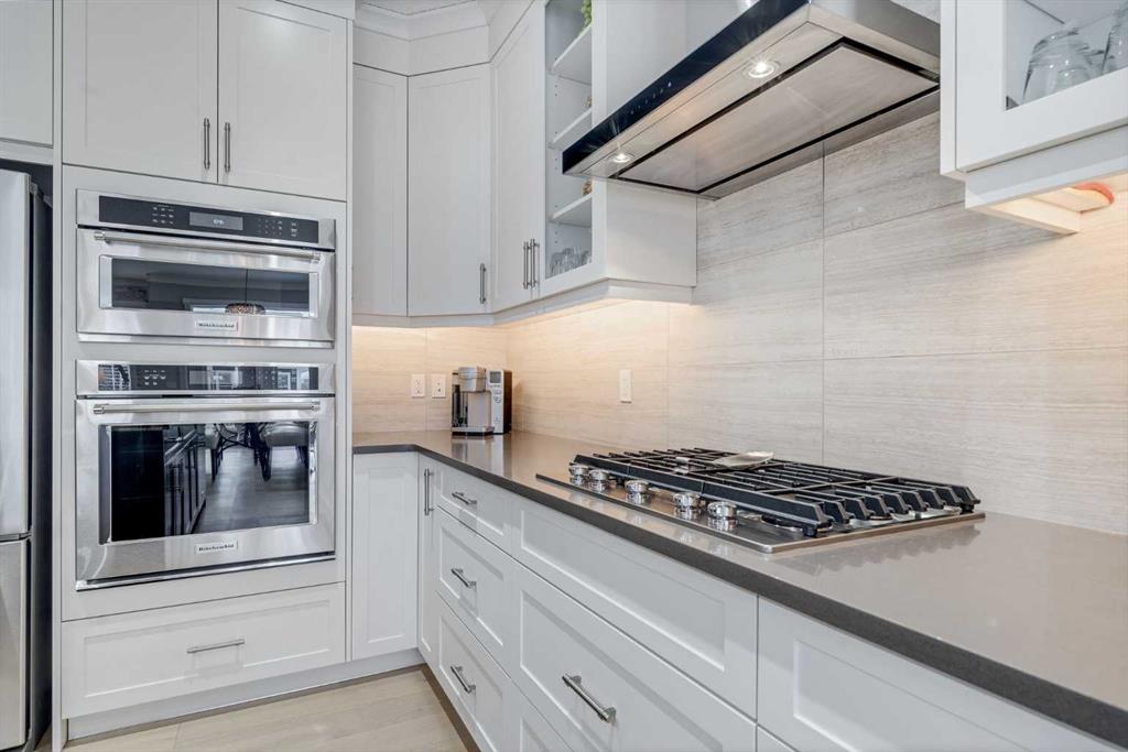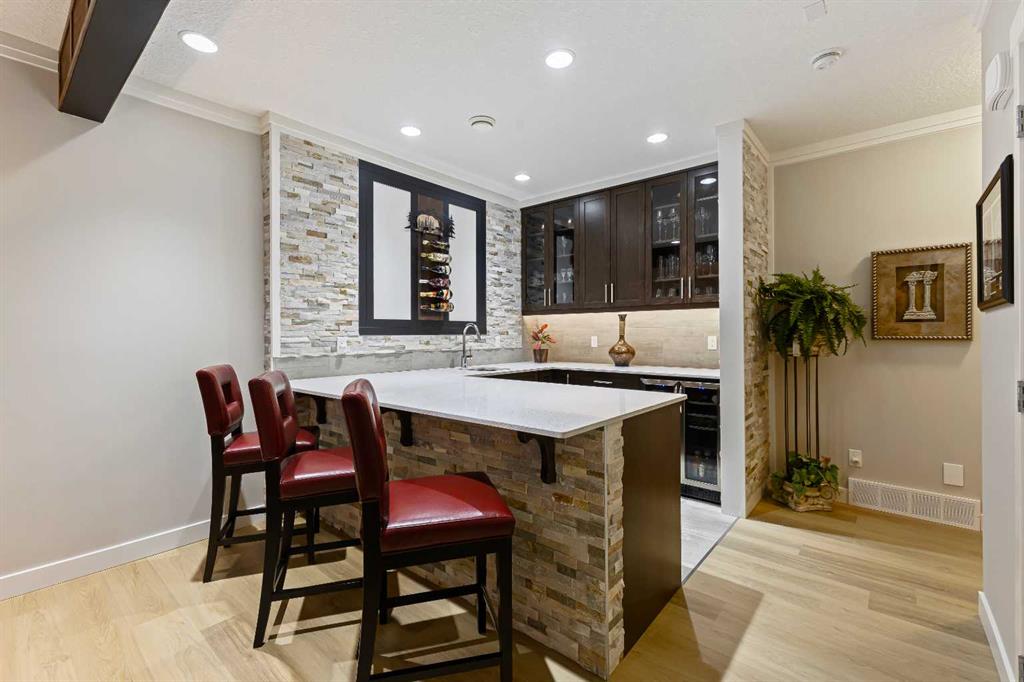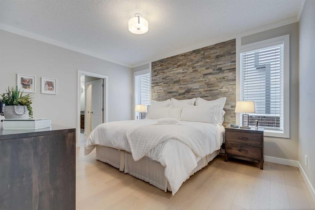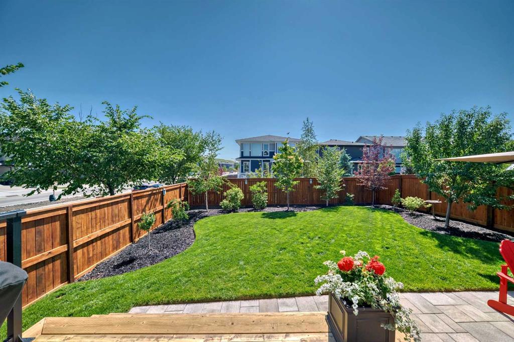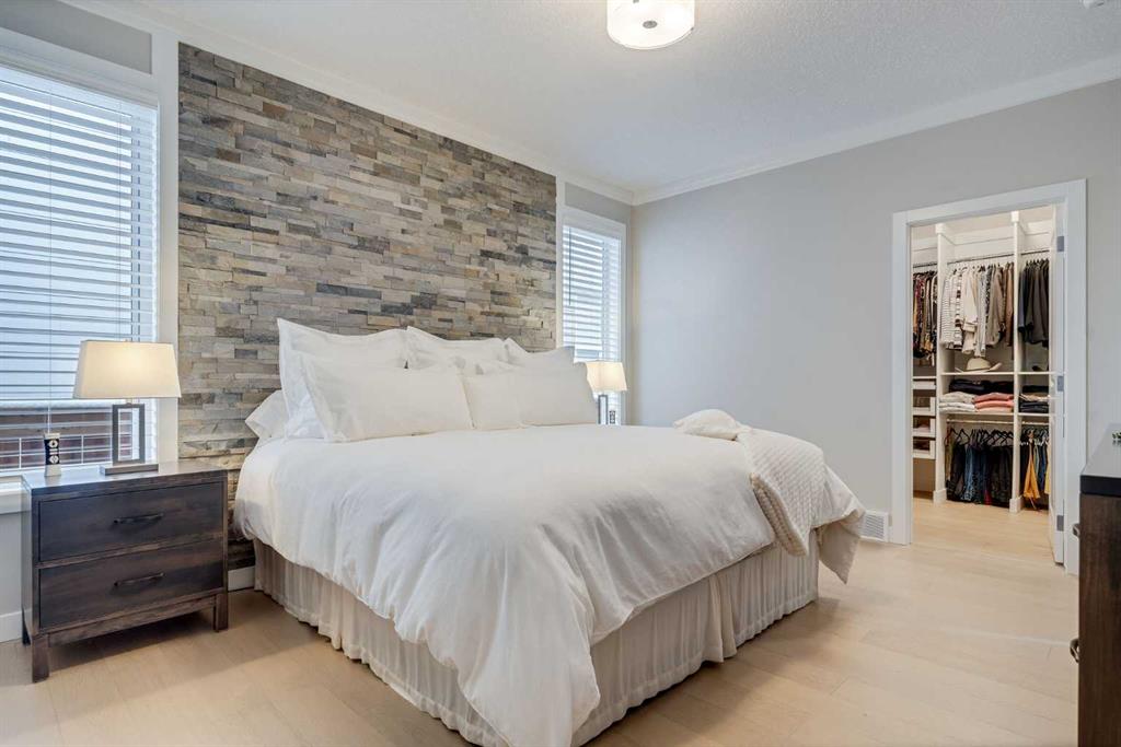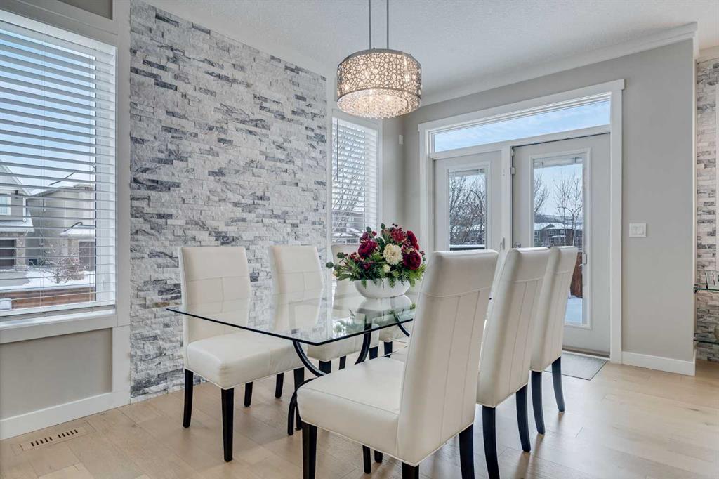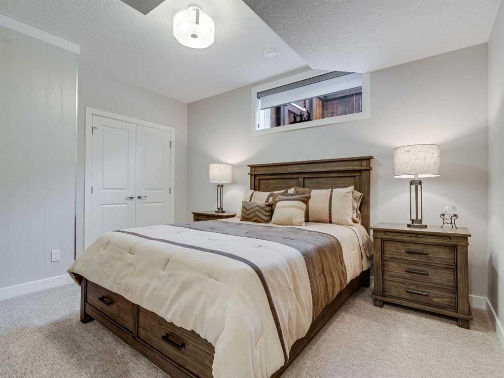 Welcome to luxury living in Cranston Riverstone. This former show home sits on a prime corner lot just steps from the scenic Riverwalk and Bow River, offering a lifestyle of elegance, comfort, and convenience. Inside, this fully upgraded, air-conditioned bungalow features over 2,712 sq. ft. of thoughtfully designed living space. The main level boasts 9′ ceilings, wide-plank engineered hardwood flooring, and detailed millwork that creates a refined, sophisticated ambiance. An open-concept layout highlights a stylish living room with a stone-clad gas fireplace (with adjustable fan), custom accent wall, and hidden compartment for a clean, clutter-free look. The chef’s kitchen is built to impress with premium built-in KitchenAid appliances, gas cooktop, custom soft-close cabinetry, under-cabinet LED lighting, and a large island featuring dual power outlets and garburator-ready wiring. The primary suite is a serene retreat with a striking stone feature wall, custom walk-in closet with glass-front drawers and full-length mirrors, and a spa-inspired ensuite with a tiled shower, bench, and built-in wall niches. The fully developed basement has just been upgraded with beautiful white oak luxury vinyl plank flooring and offers a theater-ready family room wired for 7.1 surround sound, a sleek wet bar with full cabinetry, home gym space, and a second fireplace with built-in fan. Smart and stylish throughout, this home includes keyless entry (front and garage), smart home wiring for future upgrades, central vacuum on all levels including the garage, motion-sensor lighting in closets, LED dimmer switches, and an oversized 12’ garage perfect for storage or a car hoist. The professionally landscaped yard is low maintenance and includes built-in blinds in the double garden doors, a BBQ gas line, deck outlets, two exterior water taps, outdoor pot lights on timers, hot/cold garage taps, a slat-wall garage system, and exterior keypad entry. This home truly blends luxury and lifestyle—don’t miss your chance to experience it.